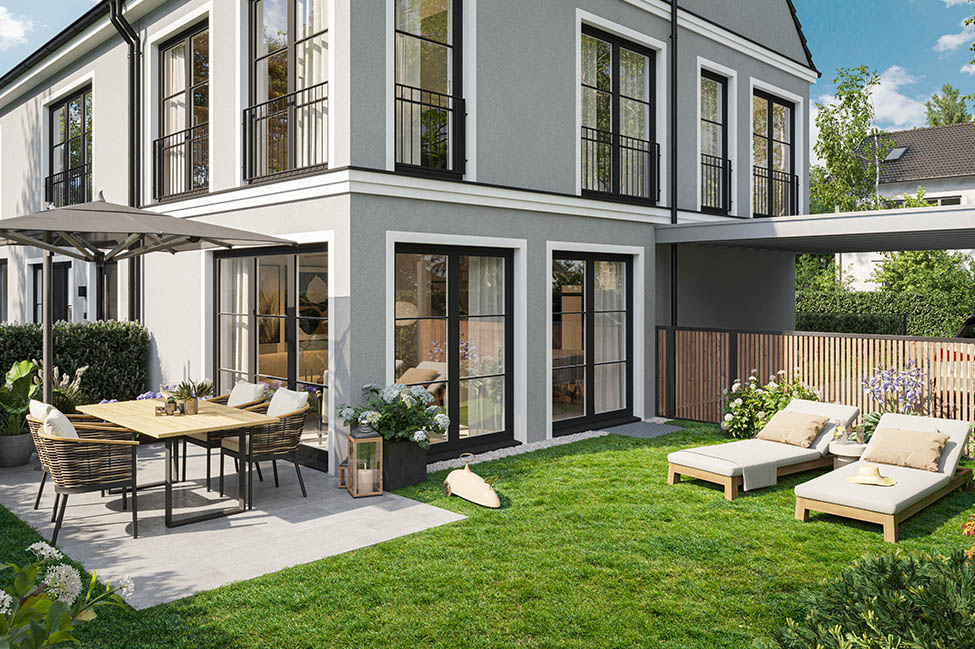 Die Häuser verbinden urbanes Wohnen in München mit einer entspannten, grünen Umgebung. Sonnige Gärten und Terrassen schaffen zusätzlichen Raum im Freien – ideal für Familien, entspannte Stunden im Garten oder gemeinsame Abende mit Freunden.